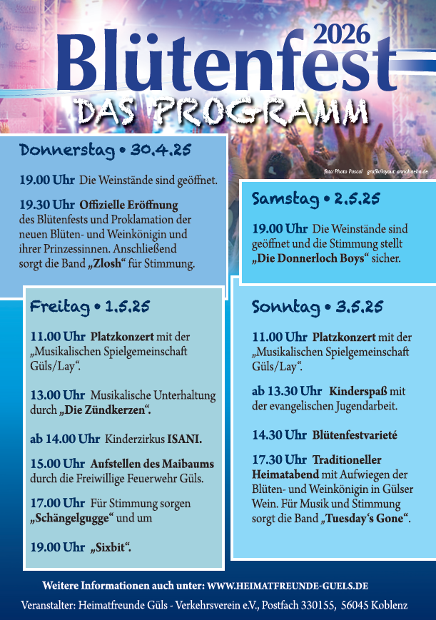 Unser Programm für das Jahr 2026: Freue dich auf vier Tage Blütenfest voller Spaß, Musik und gutem Wein!